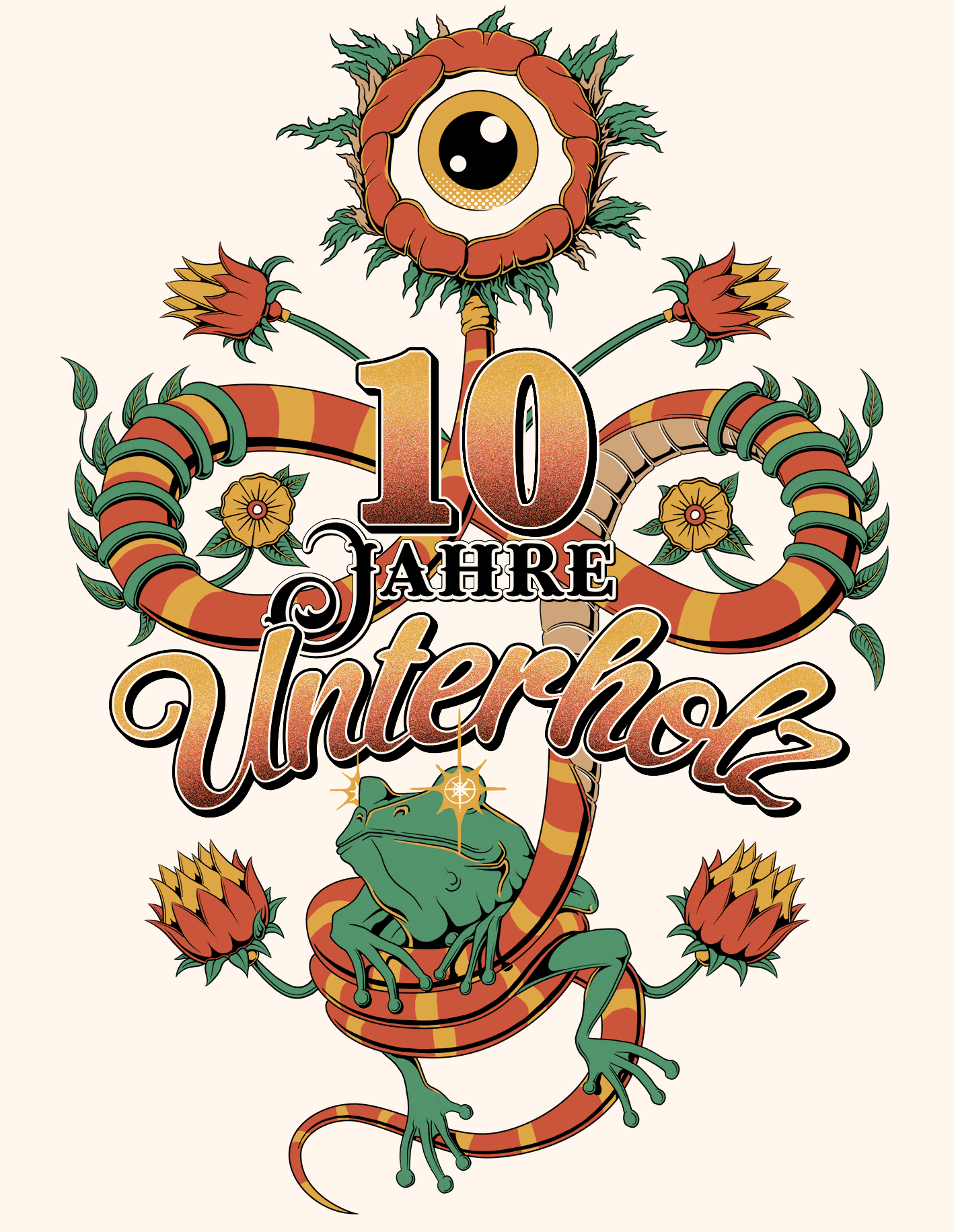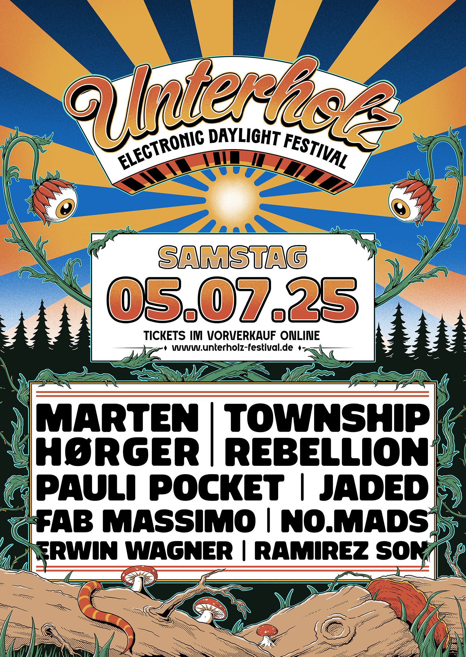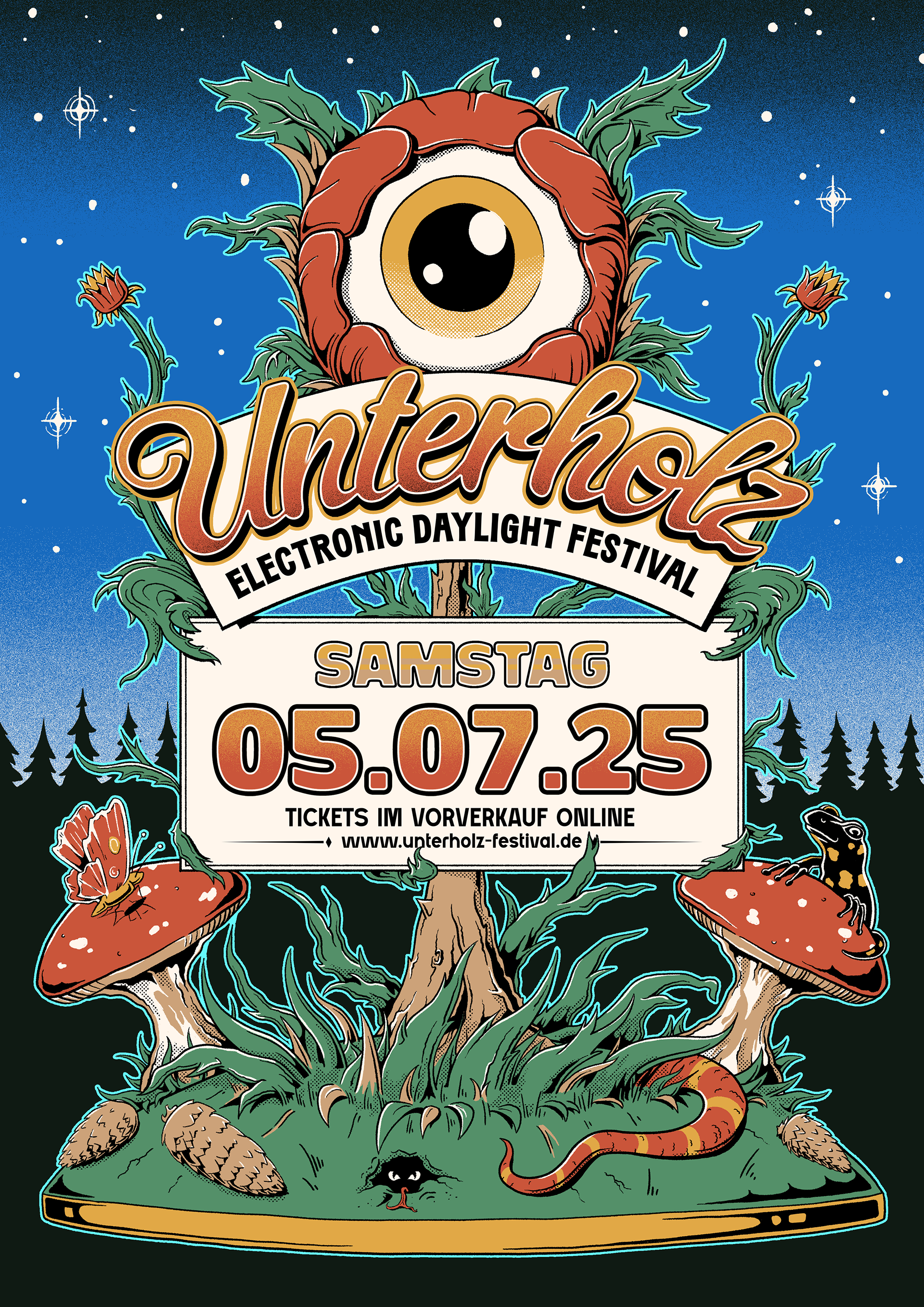 In 2025, I had the pleasure of shaping the visual identity for electronic music festival Unterholz, including posters, wristbands and merch.